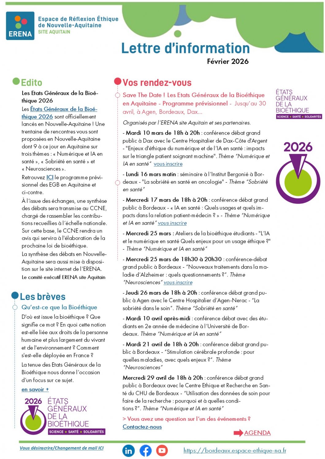 Retrouvez la Lettre d'information de l'Espace de Réflexion Ethique de Nouvelle-Aquitaine - ERENA site d'appui Aquitain de février 2026 !