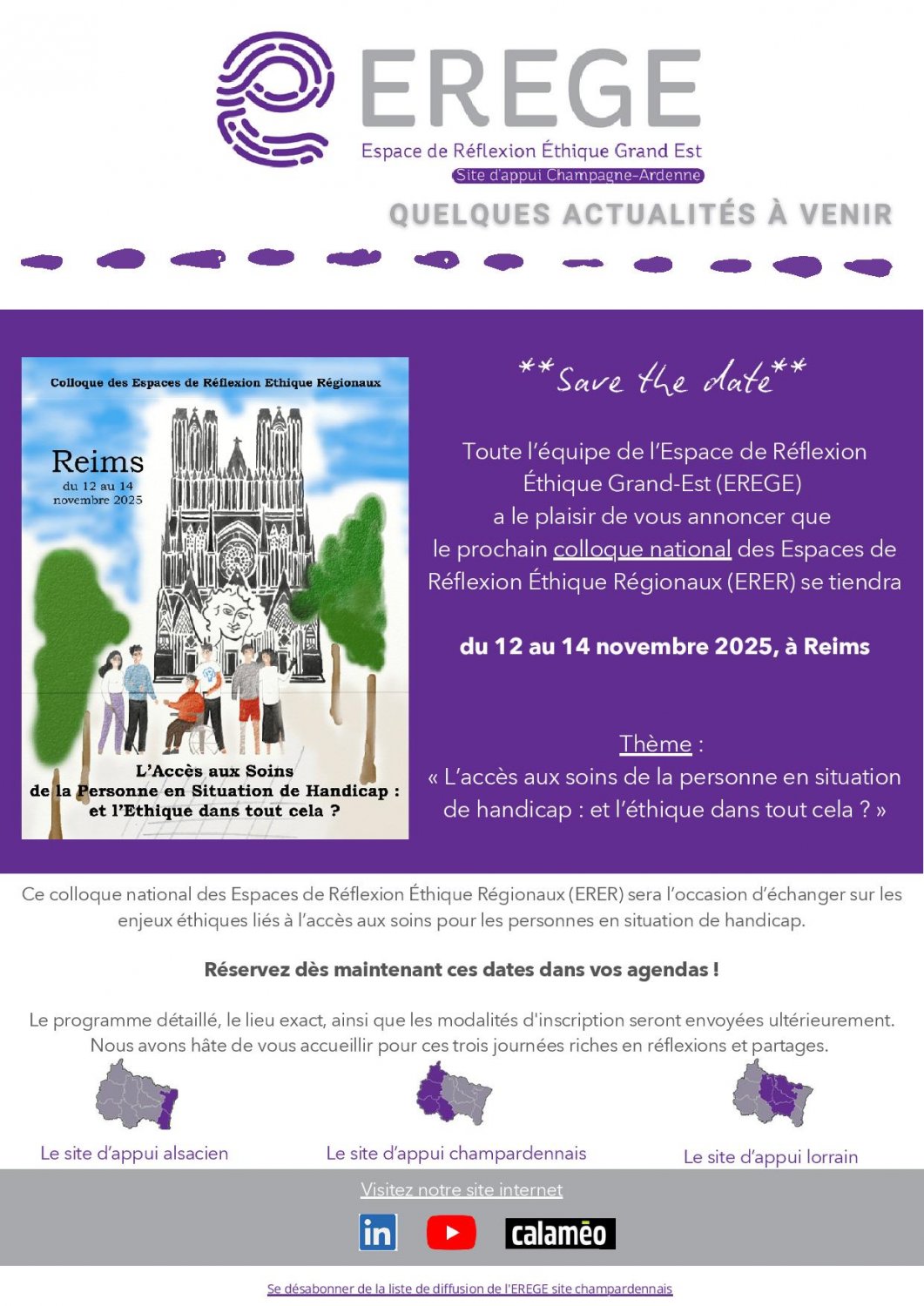 L'Espace de Réflexion Ethique Grand Est accueille et organise cette année le Colloque National des Espaces de Réflexion Ethique Régionaux, les 12, 14 et 14 novembre à Reims.