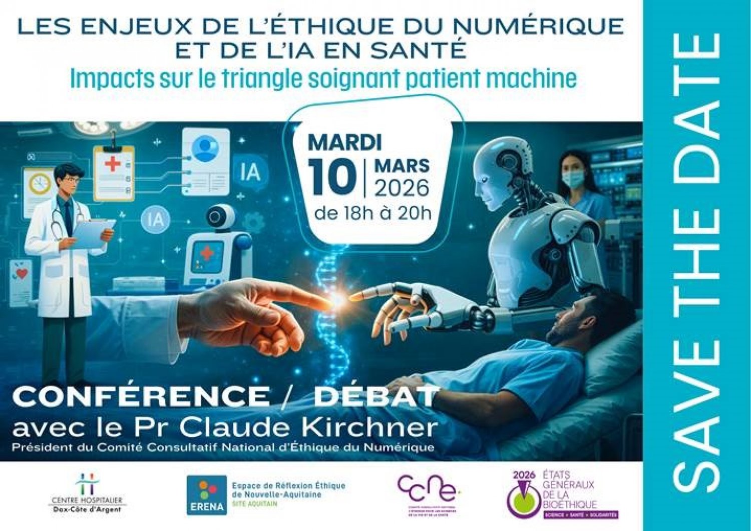 Le Centre Hospitalier de Dax-Côte d'Argent a le plaisir de coorganiser avec l’ERENA une conférence - débat consacrée aux enjeux de l’éthique du numérique et de l’IA en santé, sur la thématique “triangle soignant – patient – machine”.