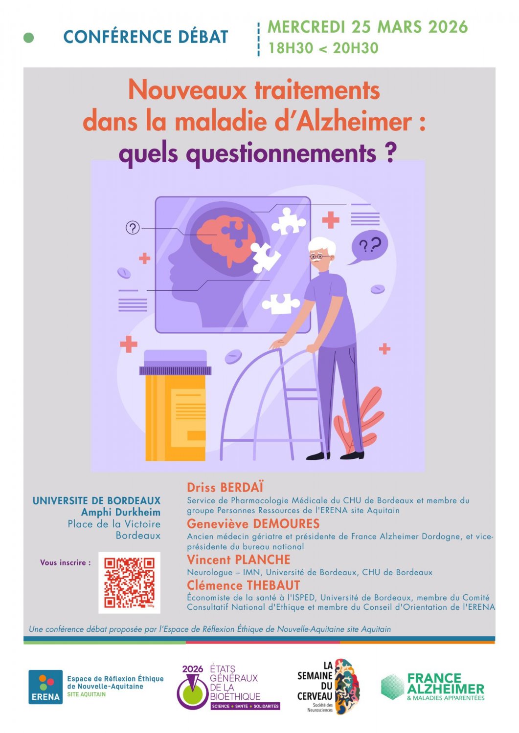 Lors de cette conférence-débat, différents aspects seront abordés : le mécanisme de la maladie d’alzheimer et les prises en charge existantes, le processus d’accès au marché des médicaments, l’évaluation de l’efficacité clinique d’un nouveau traitement, le volet médico-économique du développement d’un nouveau traitement, les réflexions éthiques sous-jacentes dont celle de l'attente forte des malades d'Alzheimer et de leurs proches.