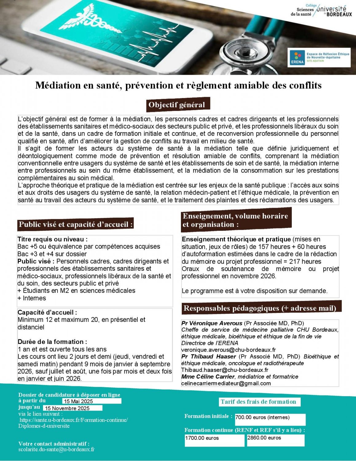 Il est créé à l’Université de Bordeaux, à compter de l’année universitaire 2025-2026, un diplôme universitaire intitulé « Médiation en santé, prévention et règlement amiable des conflits », en collaboration avec l'ERENA site Aquitain.
