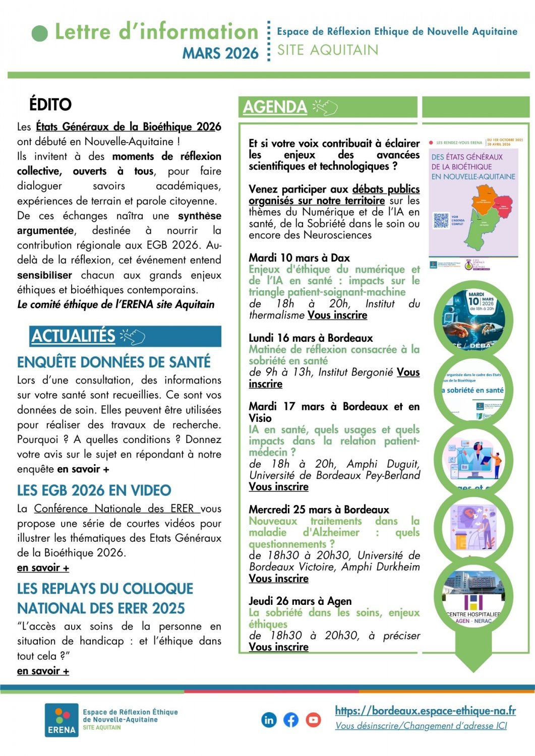 Retrouvez la Lettre d'information de l'Espace de Réflexion Ethique de Nouvelle-Aquitaine - ERENA site d'appui Aquitain de mars 2026 !