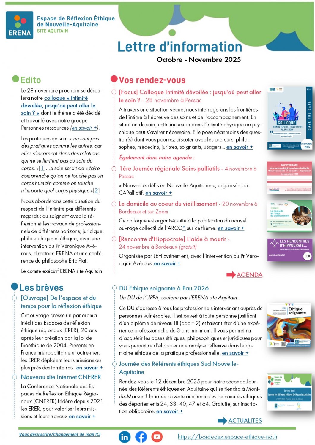 Retrouvez la Lettre d'information de l'Espace de Réflexion Ethique de Nouvelle-Aquitaine - ERENA site d'appui Aquitain d'octobre et novembre 2025 !