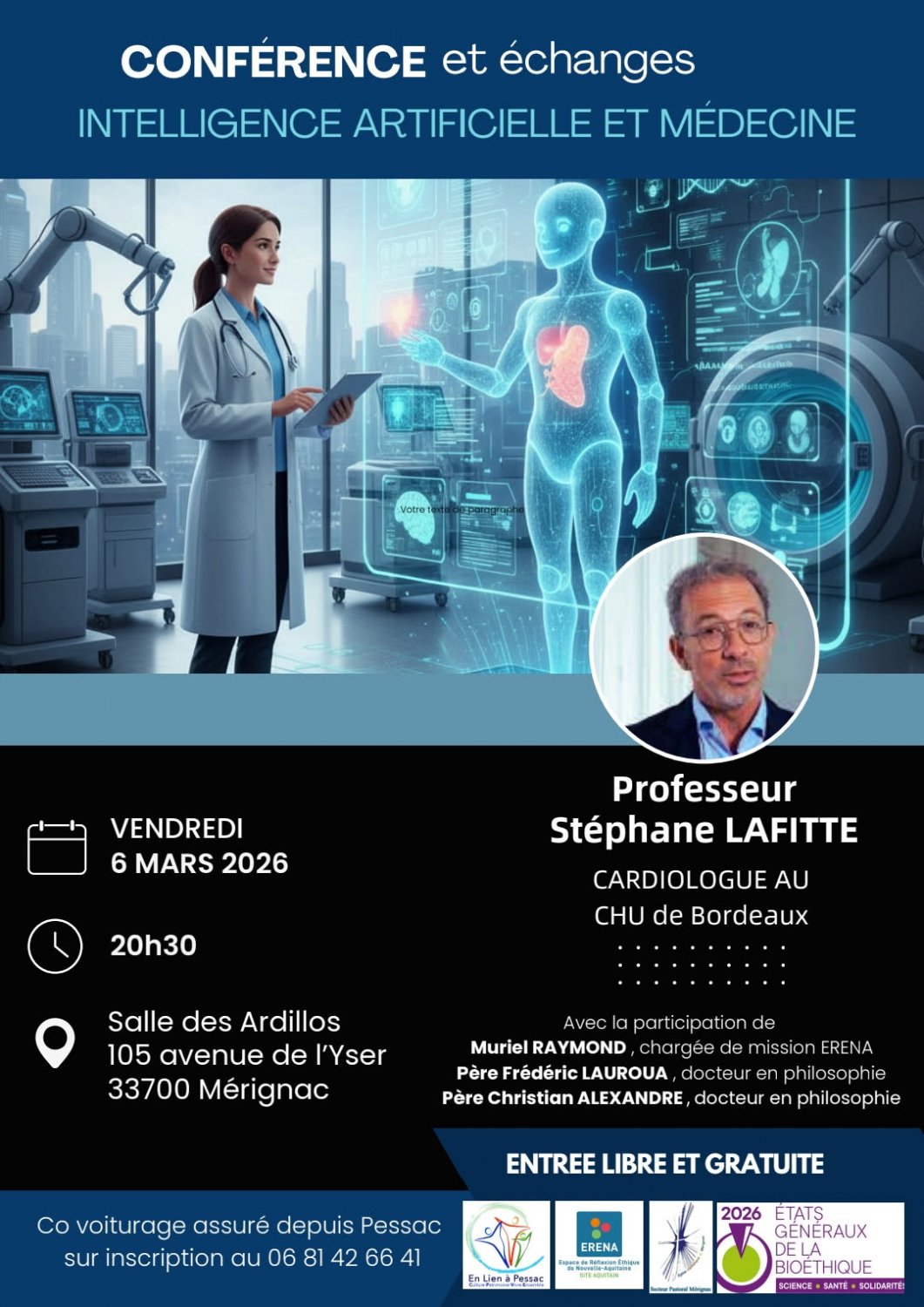 L'Association En lien Pessac a le plaisir de coorganiser avec l’ERENA site Aquitain une conférence - débat consacrée aux enjeux de l’IA en médecine.