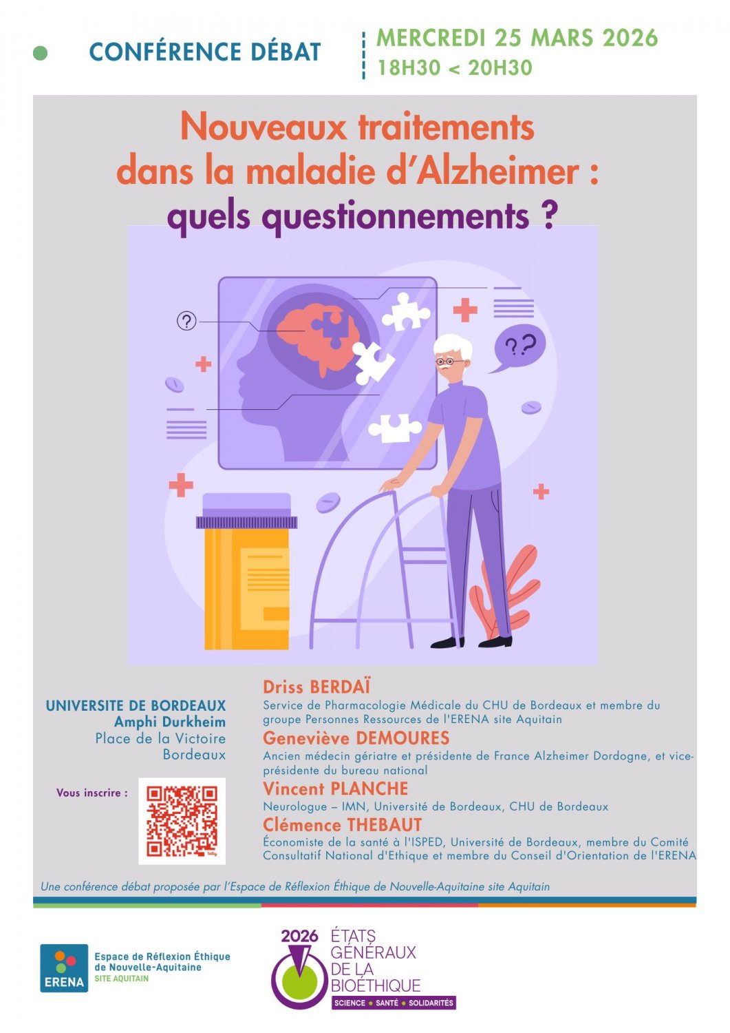 Lors de cette conférence-débat, différents aspects seront abordés : le mécanisme de la maladie d’alzheimer et les prises en charge existantes, le processus d’accès au marché des médicaments, l’évaluation de l’efficacité clinique d’un nouveau traitement, le volet médico-économique du développement d’un nouveau traitement, les réflexions éthiques sous-jacentes dont celle de l'attente forte des malades d'Alzheimer et de leurs proches.